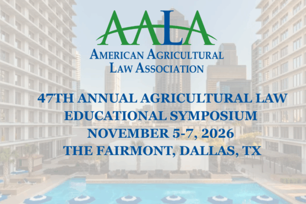 AALA will host its 47th Annual Agricultural Law Educational Symposium on November 5-7, 2026, at the Fairmont, Dallas, TX. Attendees will have the opportunity to receive up to 3 CLE credits on Wednesday and approximately 11-13 CLE credits Friday-Saturday.* Thank you to our generous sponsors, who provide invaluable support to AALA as we offer our […]